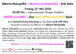 von den großen Themen erfasst wird, und verstrickt sich in Gedankenspielen “Wie – Wäre – Es – Wenn.” Für sie gilt „Rettung durch Fantasie“, denn sie weiß nicht, was sie der menschlichen Zerstörungswut entgegensetzen kann. Schimpfen? Meditieren? Singen? Doch dann findet sie unerwartet einen ihr unbekannten Pilz, der ihr eine neue Sicht auf die Welt eröffnet. Für die 2007 von der Künstlerin Brigitte Leistikow ins Leben gerufene Reihe Lyrik trifft Töne hat der italienische Komponist Alberto Mompellio sechs Gedichte der heute fast in Vergessenheit geratenen Schriftstellerin Marie Luise Kaschnitz für die Besetzung Stimme und Klavier vertont. Mompellios musikalische Interpretationen erwecken die Lyrik Kaschnitz' harmonisch und rhythmisch zum Leben und verleihen dem HEUTE wie dem EINST einen neuen Soundtrack. Brigitte Leistikow (Stimme) und Marco Ramaglia (Klavier) bringen diese musikalischen Gedichtinterpretationen als szenische Konzertlesung am 1. Oktober 2025 in